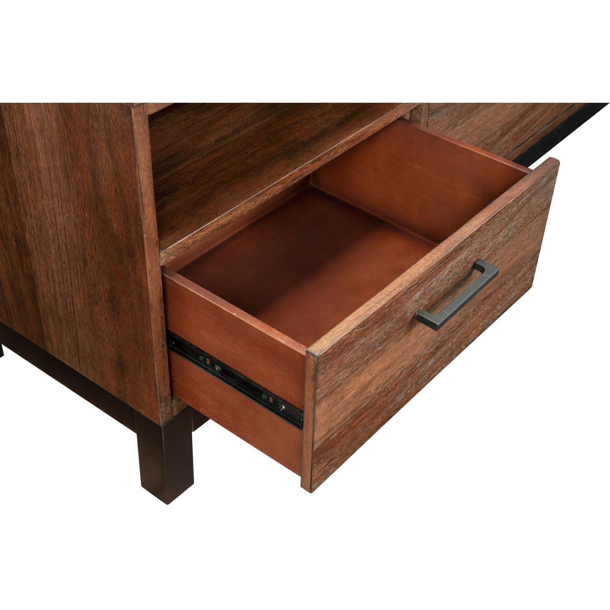 The Weston TV Console stands out with its two-tone light distressed finish, adding an air of sophistication and charm to any living space. It is designed with a sturdy English dovetail drawer construction and metal ball bearing drawer glides, providing its owner with both style and utility. Three open shelves and wire management are included, and the light assembly of legs makes this console as effortless to assemble as it is eye-catching.